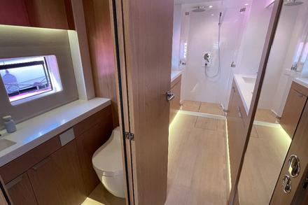 À bord, tout a été conçu pour prolonger cette impression d’espace. Le design signé Berco Design + Piaton mêle chaleur et élégance. La cuisine en U, digne d’un appartement moderne, se distingue par un grand réfrigérateur double porte, un congélateur et un vaste plan de travail. De quoi préparer des repas gastronomiques même en pleine croisière. Le carré accueille une grande banquette en L et une table XXL capable de réunir tout l’équipage. Les cabines, au nombre de trois à six selon la configuration choisie, disposent chacune de leur salle de bain privative, gage d’intimité et de confort. Ici, l’idée n’est pas seulement de naviguer, mais de vivre à bord comme dans une véritable maison flottante.