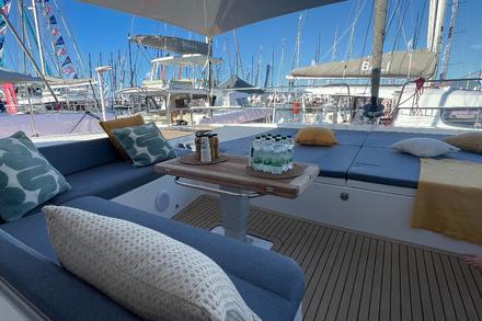Impossible d’évoquer le Bali 5.2 sans mentionner le concept open-space qui a fait la réputation du chantier. La porte oscillo-basculante à l’arrière transforme le carré et le cockpit en un seul et immense espace de vie. La lumière circule, l’air marin entre librement, et la sensation d’ouverture est totale. À l’avant, le pont plein, qui remplace le traditionnel trampoline, devient un véritable salon lounge. Une porte étanche permet un passage direct depuis le carré, un détail qui améliore autant la circulation que la sécurité. Sur le rooftop, véritable terrasse panoramique, les plaisanciers trouvent un poste de barre ergonomique, des bains de soleil modulables et des banquettes pour partager un moment entre amis. À l’arrière, la plateforme transformable en Beach Club facilite la baignade, les activités nautiques et les instants farniente au bord de l’eau.