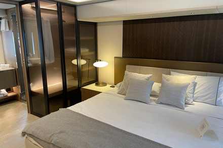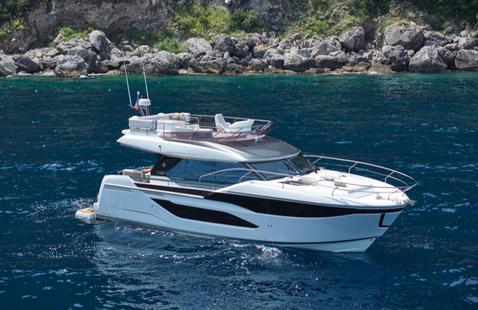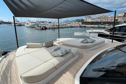 Autres options disponibles : un poste de barre intérieur - très utile en voyage et en navigation familiale - et un package baptisé « Silent Mode », une solution pour avoir tout le confort à bord pendant 12 heures sans émettre - ou quasiment pas - d’émissions d’équivalent CO2. Ce pack se compose de panneaux solaires sur le flybridge, le hardtop et le pont (2,6 kW), un parc de batteries Lithium plus important, un groupe électrogène de 27 KVA et un convertisseur plus puissant (24V / 230V / 5Kw) et d’une capacité accrue des réservoirs d’eau chaude.