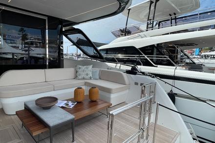 Sur le pont principal, on profite de 112m2 répartis classiquement entre le cockpit avant et ses bains de soleil qui raviront l’équipage au mouillage, l’espace intérieur avec une grande cuisine, un canapé confortable et - en option - une table intérieure pouvant recevoir, là encore, au moins 8 personnes. Le carré est baigné de lumière grâce à de généreuses fenêtres et des portes coulissantes en verre, offrant une vue panoramique. A l’arrière, ce n’est plus un cockpit, mais une véritable terrasse qui communique directement avec la mer. Canapé, bains de soleil, table et plateforme hydraulique complète cet espace essentiel à bord d’un bateau luxueux.