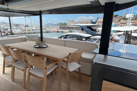 L’un des avantages du catamaran est l’espace qu’il procure dans une taille donnée. Dans le cas de la Prestige M7, un catamaran à moteur de 58 pieds (17,84 m) ce sont pratiquement 200 m2 habitable - entre l’intérieur et l’extérieur - qui sont proposés. Une surface de vie que l’on trouve habituellement sur des yachts monocoques de... 75 pieds ! Mais un tel volume disponible n’a de sens que dans le cas où il est mis en valeur intelligemment. Pari réussi pour le studio Garroni Design, qui parvient à offrir des aménagements intérieurs innovants et flexibles. L’objectif clairement affiché est de fluidifier au maximum la circulation à bord, d’interconnecter les espaces bateau/mer. Par exemple, on accède directement du passavant bâbord à l’intérieur via une porte de coupée et, de là, à l’escalier qui vous permet de monter vers le fly qui est donc accessible de l’intérieur et pratiquement de l’extérieur. Puisque nous sommes sur le fly, on y appréciera un poste de pilotage complet et agréable ainsi qu’un immense solarium bien protégé par les parebrises enveloppants. En option, il sera possible de choisir un hardtop ouvrant. Cet espace de 35m2 propose également une grande table pouvant accueillir 8 personnes, et une cuisine entièrement équipée avec un bar.
