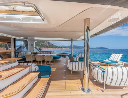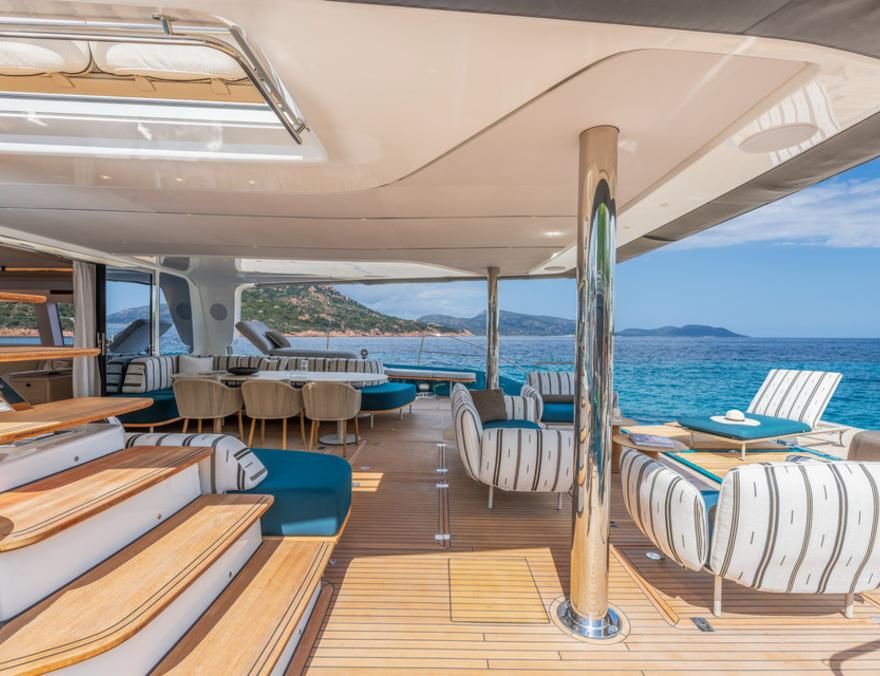 C’est un aménagement complet des espaces extérieurs qu’a réalisé Sunbrella pour cette unité avec des compositions textiles sur mesure. Les jeux de textures et les subtiles associations de couleurs mettent en valeur la richesse de la faune et des décors qui rythment le voyage. Les tissus s’inspirent des couleurs des lagons polynésiens, de leur végétation luxuriante et de leurs eaux émeraude, tout en répondant aux exigences de la navigation hauturière. Ils sont particulièrement reconnus pour leur résistance aux UV, aux intempéries et à l’usure du temps.