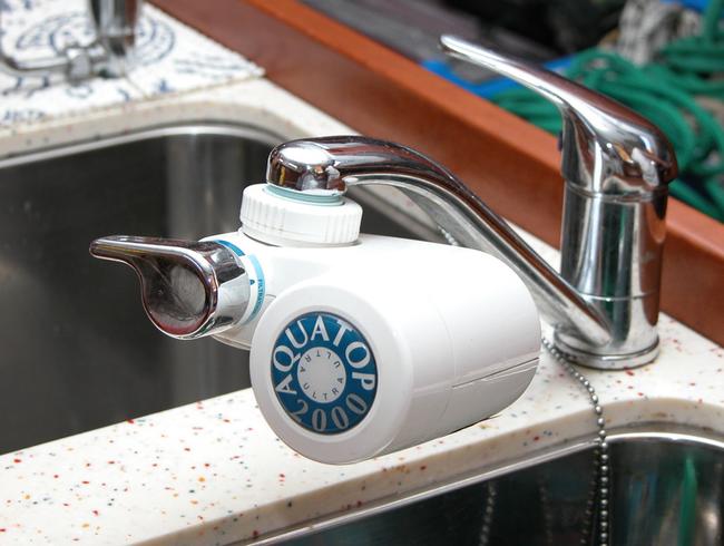 Sur le marché, on trouve des produits pour le nettoyage des réservoirs et pour traiter l’eau. Mais, attention, il faut toujours prendre des produits pouvant entrer au contact de denrées alimentaires. Pour nettoyer efficacement les réservoirs et éliminer les dépôts, il existe des nettoyants spécifiques comme le T.S.4 (Matt Chem). Ce produit permet d’éliminer les boues présentes en fond du réservoir. En premier, il faut vidanger complètement le réservoir, mettre 1 volume de T.S.4 pour 3 à 5 volumes d’eau. Laisser agir pendant une heure. Si vous avez une trappe de visite sur le réservoir, brossez les parois. Ensuite, ajouter 20 litres d’eau et vidanger en laissant ouvert tous les robinets. Terminer le travail en rinçant la cuve à l’eau claire. Remplir à nouveau avec de l’eau et un litre de KILBACTE. Puis renouveler l’opération : vidange et remplissage. Au dernier remplissage, ajouter un traitement tel que le KILBACTE à raison de 25 ml pour 100 litres d’eau. Chez les accastilleurs, des produits de traitement et de conservation sans chlore pour éviter les bactéries sont proposés. Nous pouvons citer : chez Yachticon l’Aqua Clean, chez Katadyn le Micropur (poudre ou cachet), le Pura Tank pour le nettoyage, etc. Il est important de bien lire la notice et de vérifier que le produit est compatible avec les produits alimentaires.