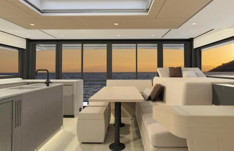 À l’intérieur, l’effet « loft » tranche : pare-brise courbe sans montant pour dégager totalement la vue, 2,20 m de hauteur sous barrots et vitrages abondants prolongent naturellement le carré vers l’extérieur. La nacelle distingue un salon et un coin repas, tandis qu’une vaste cuisine « XXL » devient le cœur de vie à bord ; jusqu’à cinq cabines et quatre salles d’eau garantissent l’intimité, avec un accès direct à la cabine équipage depuis le cockpit pour fluidifier les circulations.