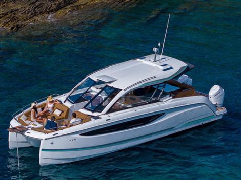 Ce catamaran à moteur a été conçu pour conjuguer l’esprit d’un dayboat sportif et le confort d’un cruiser haut de gamme.