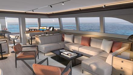 Lagoon a imaginé un yacht où la vie à bord s’articule autour des 300 m2 d’espaces extérieurs. Le pont principal, de plain-pied, prolonge naturellement les volumes intérieurs vers la mer. À l’arrière, la plateforme de 22 m2 accueille l’annexe et le jet-ski tout en restant un espace convivial pour les baignades et les déjeuners au mouillage. Les zones de repos, réparties entre les différents ponts, favorisent une circulation fluide et un contact permanent avec l’environnement marin.