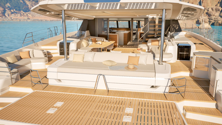 Le FPY 70S se distingue avant tout par son sens du volume et du confort. À bord, les 226 m2 habitables se vivent comme une villa sur l’eau : tout y respire l’équilibre entre élégance et fonctionnalité. Le salon-terrasse arrière de 51 m2 s’ouvre sur la mer comme un prolongement naturel du carré, tandis que le flybridge panoramique de 31 m2 offre un espace de détente idéal pour profiter du mouillage ou de la navigation sous voiles. À l’avant, un salon sur terrasse équipé d’un spa de 26 m2 invite au farniente.