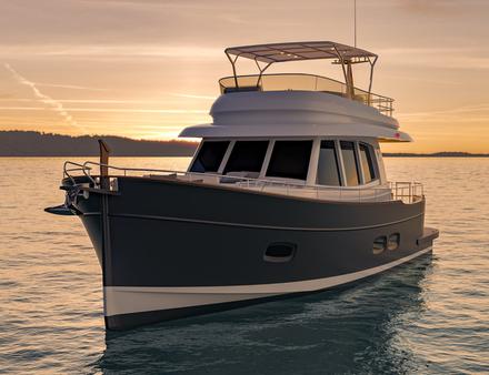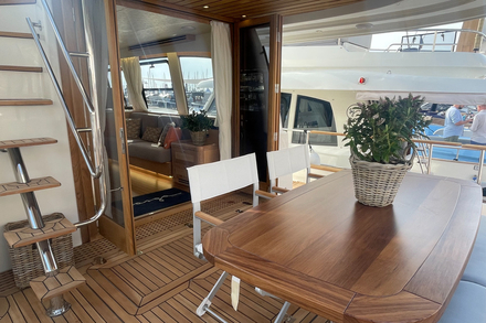 Le pont principal se distingue par un aménagement fluide et dégagé, invitant à la détente autant qu’à la convivialité. Le cockpit arrière, protégé, prolonge naturellement le carré intérieur, idéal pour partager un repas face à la mer. À l’étage, le flybridge bien intégré offre un poste de pilotage dominant, un bain de soleil et un salon extérieur, transformant chaque sortie en véritable moment de plaisir.