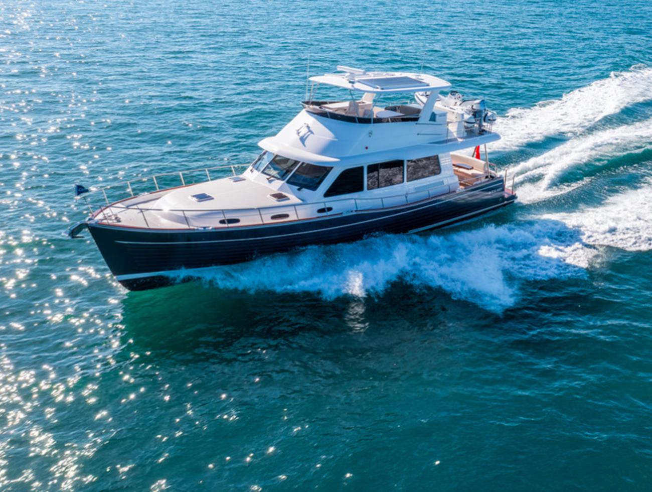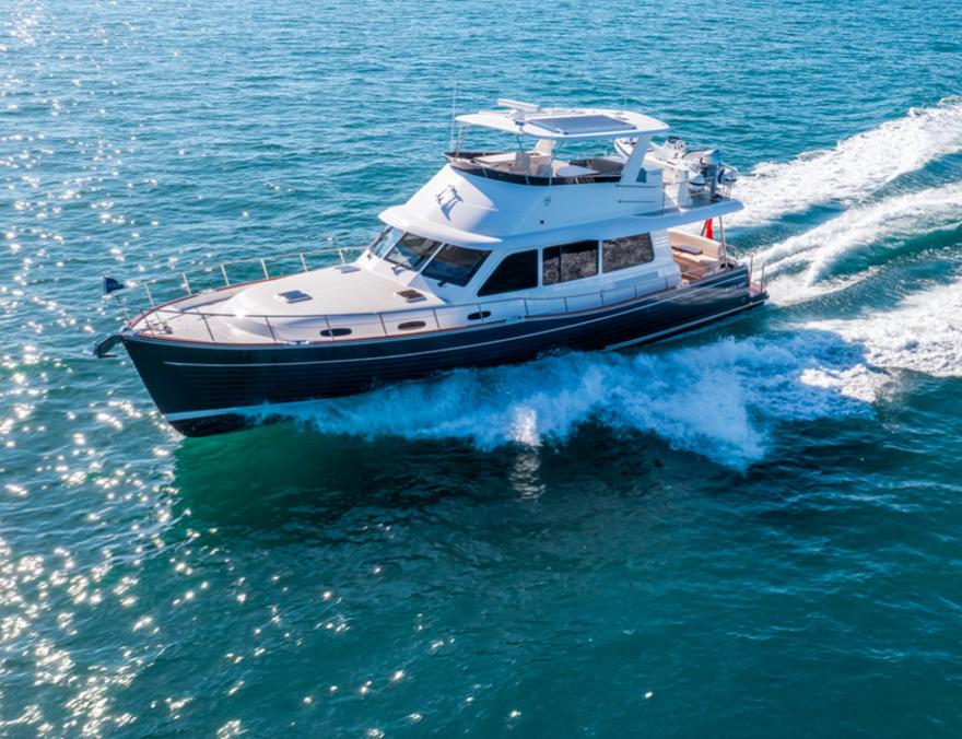 Derrière son allure intemporelle, le GB54 EU Edition embarque une architecture avancée. Sa carène V-Warp®, peinte en Steel Blue, permet de réduire la consommation jusqu’à 60 % par rapport à d’autres yachts de taille comparable. Propulsé par deux Volvo D13 de 900 ch sur lignes d’arbre, il affiche une vitesse de croisière confortable de 20 nœuds, soutenue par des propulseurs d’étrave et de poupe pour une manœuvrabilité précise dans les ports les plus exigus.