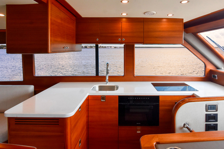 Le pont principal réunit un salon accueillant, un espace repas, un poste de pilotage intérieur et une cuisine européenne parfaitement intégrée pour un usage quotidien efficace. Des stores électriques, la climatisation intégrale et le chauffage central permettent de profiter du bateau toute l’année, quelles que soient les latitudes.