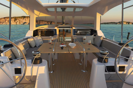 Le cockpit, protégé par des hiloires, une casquette rigide et un hardtop, forme un véritable cocon. Toutes les manœuvres sont regroupées aux postes de barre, libérant l’espace central pour la vie à bord. La grande table en deux parties permet de circuler aisément vers les barres, les passavants ou la plateforme arrière, sans jamais avoir à enjamber d’obstacles.