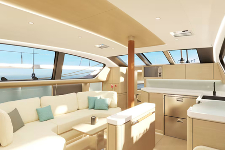 La disposition a été entièrement revisitée autour d’un îlot central qui structure l’espace et facilite la circulation en mer. Le carré devient un véritable salon, la cuisine s’affirme comme un espace central et convivial, tandis que la table à cartes à double assise se transforme tour à tour en bureau ou en coin détente. L’ensemble respire, sans jamais perdre en fonctionnalité.
