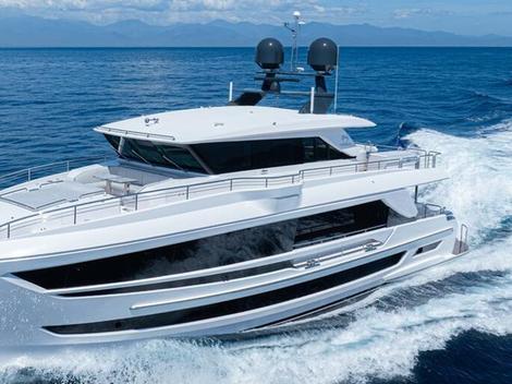 La FD80 Skyline Hull 15 marque un tournant pour Horizon en Europe. Première FD80 destinée au continent, cette unité se distingue immédiatement par son mât radar anthracite, signature visuelle forte qui souligne le profil Skyline. À l’intérieur, le parti pris est résolument contemporain : teck blanchi, touches de "gunmetal" brossé et larges surfaces vitrées créent une atmosphère lumineuse et apaisée, avec un salon principal ouvert sur la mer grâce à des baies vitrées pleine hauteur.