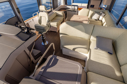 La suppression du flybridge libère un volume clé : le toit du carré. Résultat immédiat, un immense toit vitré qui transforme l’ambiance intérieure. La lumière naturelle inonde le salon, renforçant la sensation d’espace et de continuité avec l’extérieur. Cette signature Nimbus, déjà présente sur les Coupés historiques, atteint ici une ampleur inédite, sans jamais sacrifier le sentiment de protection.