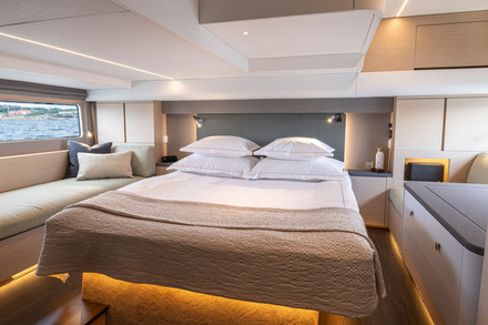 Sur la version Flybridge, une partie de la cuisine était contrainte par l’escalier menant au pont supérieur. Sur le Coupé, cet espace est entièrement récupéré. Le gain est immédiat : plus de plan de travail, une circulation plus fluide et une implantation qui permet à deux personnes de cuisiner confortablement. Un détail en apparence, mais essentiel pour celles et ceux qui vivent plusieurs semaines à bord.
