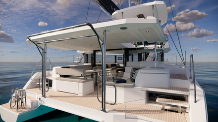 Pour les propriétaires privés souhaitant un pont avant plus épuré, le chantier propose désormais, en option, un longeron composite intégré sous le trampoline, en alternative au longeron aluminium traditionnel qui divise le trampoline en 2 parties, qui reste bien sûr disponible au catalogue. La nouvelle configuration permet d'avoir un trampoline d’un seul tenant tout en proposant la possibilité d’ajouter des voiles de petit temps, telles qu'un Code 0 ou Code D, y compris en retrofit après un programme de gestion Sunsail/Moorings.