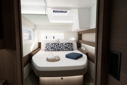 Le concept éprouvé de vie intérieure/extérieure se poursuit à bord du Leopard 43, avec une porte coulissante vitrée reliant le cockpit arrière au carré. Ouverte, elle transforme ces espaces en une vaste zone de réception ; fermée, chaque espace reste pleinement fonctionnel et confortable. Le lounge situé sur le roof a été avancé afin d'être directement adjacent au poste de barre, améliorant la communication entre le skipper et les passagers tout en renforçant la visibilité et la sécurité. Signature emblématique des catamarans Leopard, la porte d’accès directe au cockpit avant est conservée sur le Leopard 43. Elle est désormais complétée par une nouvelle banquette très confortable dans le cockpit avant, créant un espace de détente supplémentaire et protégé. Cette porte avant offre plusieurs avantages. Elle favorise la ventilation tout en offrant un accès sécurisé au cockpit avant.