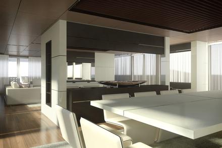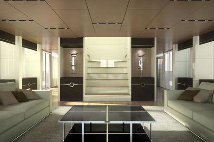 Lumineux et luxueux, le bateau affiche des lignes harmonieuses et une vue panoramique sur la mer. A l’extérieur, il propose plusieurs espaces de détente dont une terrasse, dotée d’un bar et d’une douche, mais également des espaces dégagés permettant une circulation fluide sur le bateau. Le pont avant a quant à lui été pensé de manière différente et ne ressemble pas à ceux que l’on a l’habitude de retrouver sur les yachts traditionnels. Entièrement dégagé, il se transforme aisément en espace de détente où propriétaire et invités peuvent se retrouver autour du bain à remous idéalement située à l’abri des regards. A l’intérieur, une grande attention a été portée aux détails mais également au design. Le contraste de couleurs et de matériaux couplé à la grande luminosité conférée par les larges ouvertures latérales vient d’ailleurs renforcer le côte luxueux du bateau mais également la luminosité intérieure.