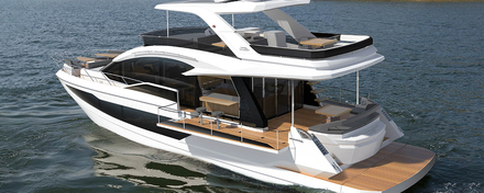 Et sur le pont inférieur, on retrouve un balcon de six mètres de long qui se déplie avec un plancher partiellement vitré sur le côté bâbord du motor-yacht. A l'extérieur, la salle à manger du cockpit arrière peut accueillir jusqu'à huit personnes pouvant, après dîner, se détendre devant un téléviseur à écran plat. Un pare-soleil arrière électrique permet de ne pas être dérangé par les rayons du soleil. Tout à l'arrière du 640 Fly se trouve une plateforme de bain hydraulique offrant un accès facile à l'eau et avec un accès direct depuis la terrasse arrière et la cabine du skipper, située dans le prolongement. A l'intérieur, vous trouverez de vastes espaces salon et dîner avec des fenêtres latérales ouvrantes du côté du bar et du poste de pilotage pour profiter du clapotis des vagues au mouillage. La disposition a été complètement revue et réfléchie pour pouvoir accueillir quatre cabines. Côté décoration, modernisme et finitions soignées sont au programme donnant au Galeon 640 Fly un esprit d'une vedette italienne... Le Galeon 640 Fly sera exposé au prochain Cannes Yachting Festival en septembre.