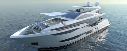 L'espace extérieur est composé d'une grande zone à l'arrière du salon sur le pont principal, idéal pour manger ; le flybridge dispose d'un jacuzzi, de vastes espaces de repos et d'un bain de soleil, d'un wet-bar avec évier, d'un barbecue, d'un réfrigérateur et d'une machine à glaçons. Une porte incurvée vers l'avant mène au pilothouse. À la poupe, le Jet-Ski et le garage à annexe peuvent être ouverts pour révéler une plateforme de bain à commande hydraulique.