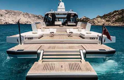 La fusion des influences classiques et modernes trouve sa parfaite expression dans le tableau arrière où les lignes sont complètement intégrées dans le volume de la coque, à la manière de ses précurseurs iconiques des années 60. Il y a cependant une petite touche d'originalité, sous la forme d'un club de plage, conçu pour répondre aux attentes des propriétaires de bateaux d'aujourd'hui. Il s'agit d'une légère différence dans la forme générale, la face centrale du tableau arrière étant fortement inclinée vers le bas, de sorte qu'une fois ouverte, elle offre une vaste plate-forme de baignade, entièrement consacrée au bronzage, le garage abritant l'annexe et le jet-ski étant discrètement dissimulé sur le côté du yacht.
