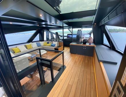 Le pont supérieur est accessible soit par la grande descente extérieure communiquant avec les deux ponts, soit par l’escalier intérieur en carbone. On y trouve à ce niveau un salon panoramique plus petit et très cosy, avec un accès au deck extérieur situé à l’arrière. Sur l’avant du dit salon la timonerie, séparée par une cloison et porte vitrées. Le poste de pilotage occupe une grande partie de la largeur du navire, deux portes latérales à la console de pilotage permettent de se rendre sur la plage avant. Le capitaine dispose également de commandes déportées intégrées discrètement dans le pavois sur chaque bord pour accoster avec une excellente visibilité latérale.