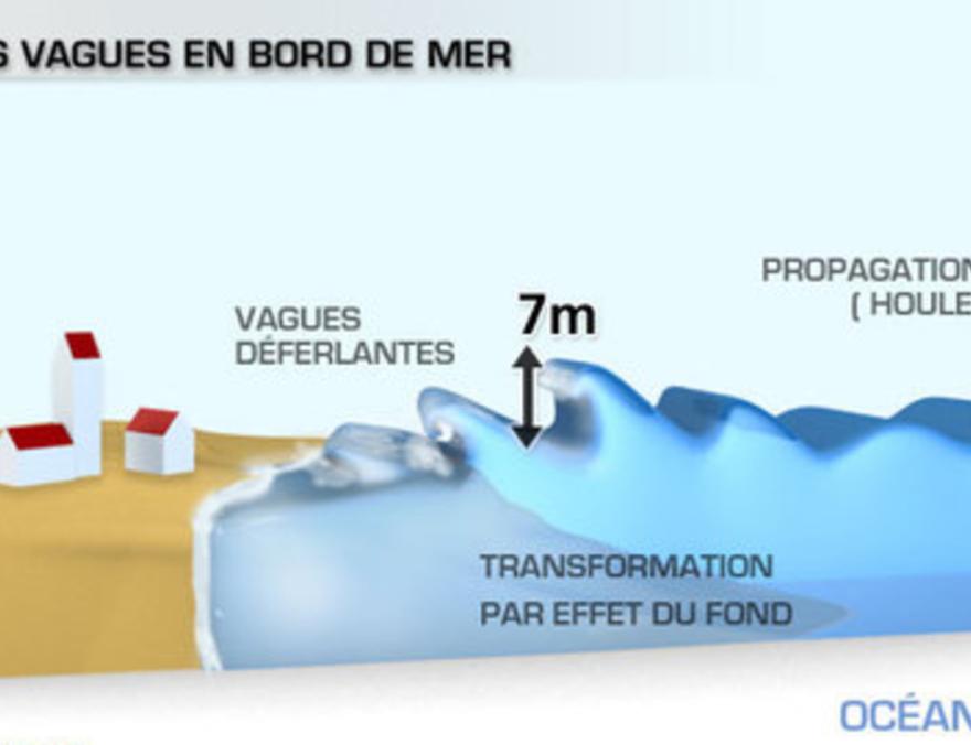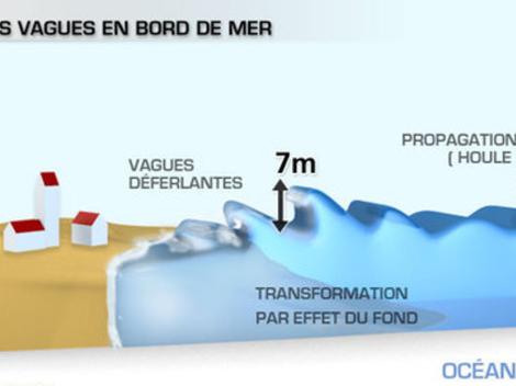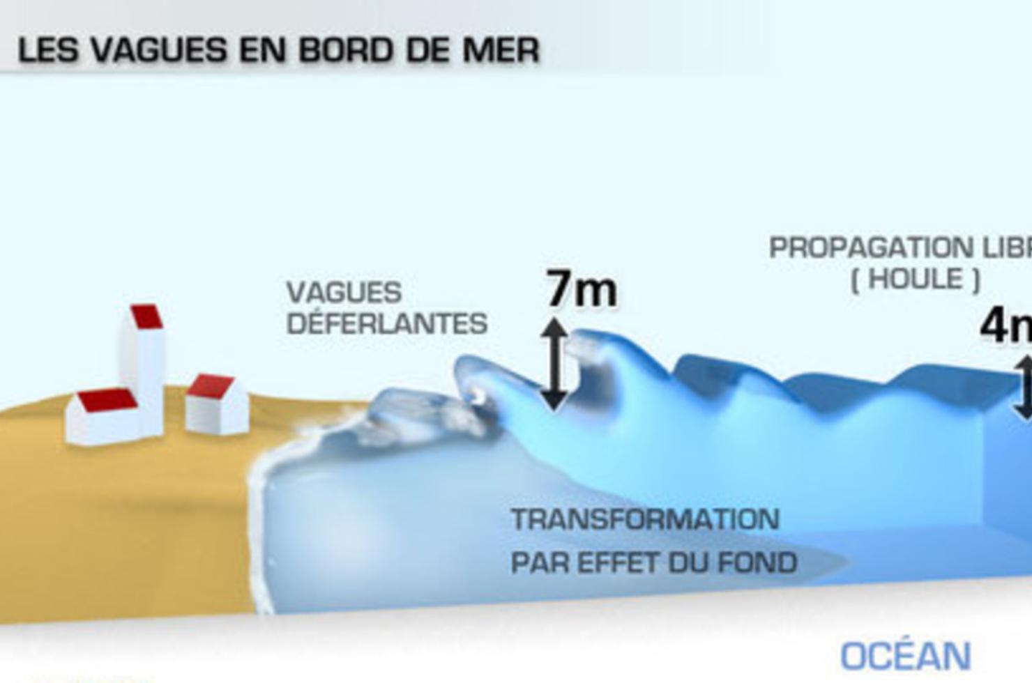 Ce soir, en Bretagne, ce sont des vagues de 5m au large qui viendront s’effondrer sur notre littoral. Mais une vague n’est pas seulement une ondulation à la surface de la mer, les plongeurs vous le diront, elle joue aussi son mouvement en profondeur. Et c’est ce mouvement qui est contrarié par la remontée du fond sous-marin. La vague subit alors comme un croche-patte. Elle se cabre, s’élève puis s’effondre plus ou moins brutalement. Comme sa chute est élégante… on dit qu’elle déferle. Plus la vague est puissante, plus sa déferlante ira loin.