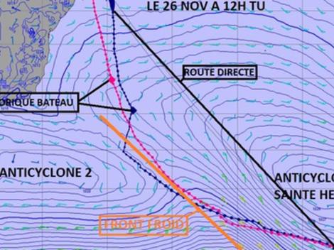 La carte ci-dessus représente la situation de l'anticyclone de Sainte-Hélène pour le lundi 26 novembre à 12H TU. Le routage théorique d'Armel Le Cleac'h (Banque Populaire) est en bleu tandis que la ligne rose représente Synerciel, le voilier de Jean Le Cam. Vous pouvez donc suivre la route théorique de ces deux concurrents jusqu'à la première porte des glaces imposée par le règlement.