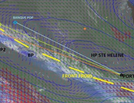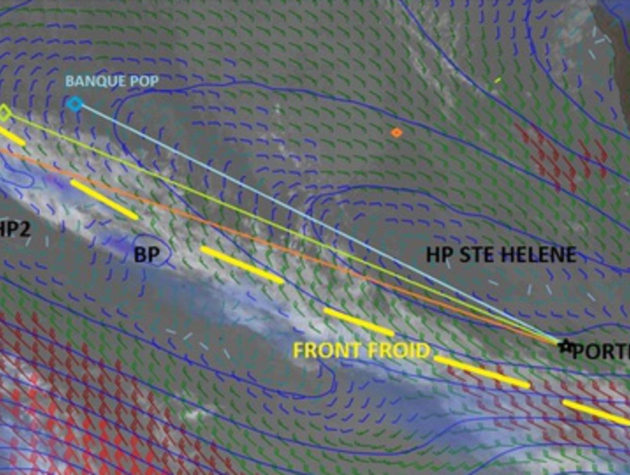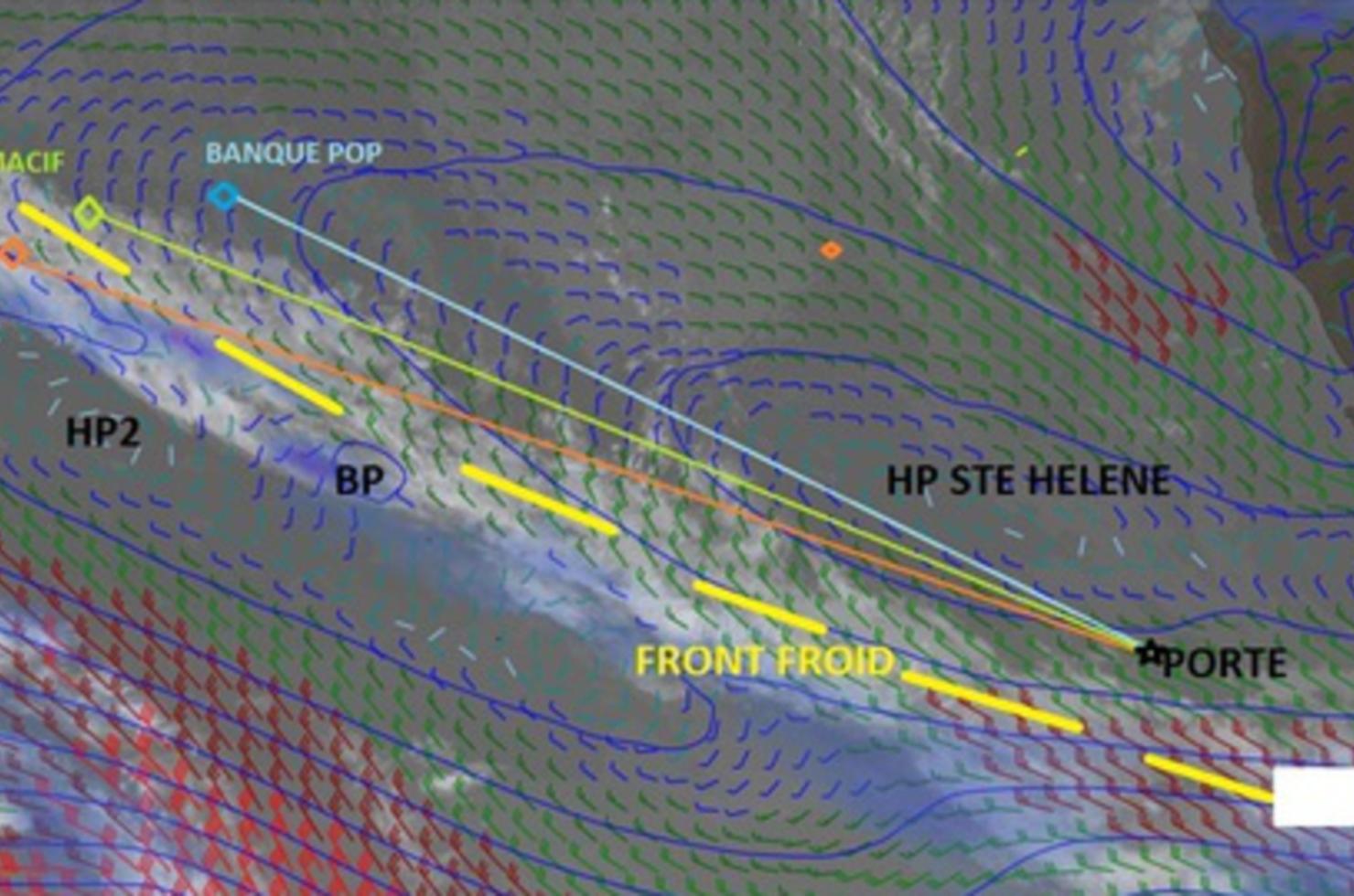 Banque Populaire a choisi de rester proche de la route directe en espérant ne pas traverser cette zone de transition et en espérant qu’elle se résorbe dans son Sud. Ce genre de phénomène est souvent mal apprécié par les modèles météo. Pour cette raison et du fait de sa difficile position de leader il n’a sans doute pas voulu s’écarter trop de la route directe.