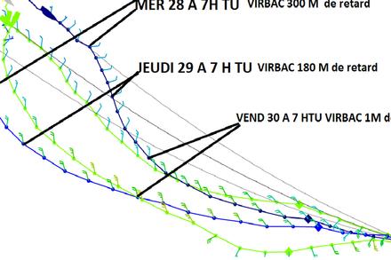 Ci-dessous les routages théoriques avec les positions toutes les 24 h des deux bateaux et l’évolution du retard de Virbac sur Banque Populaire.
