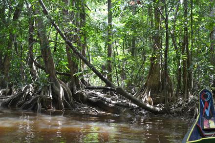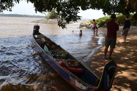 La coque est traditionnelle. Notre pirogue, comme la plupart de celles que l’on croise, est construite et pilotée par un Bushinengué, nom qui signifie nègre des bois. Ce peuple, d’origine africaine, avait déserté dès le début du XVIIème siècle les plantations pour vivre sur les rives des fleuves. Autant dire leur parfaite connaissance du fleuve et de la forêt. Tigana (les « mateurs de foot » devineront son année de naissance), chevelure Marley, peau d’ébène et carrure de commando de marine, dégage à la machette un passage dans la mangrove pour nous présenter quelques arbres (pas tous, il y en 1500 espèces dans la forêt amazonienne) dont il tire le bois de charpente pour les carbets, les palmes pour les toitures, les lianes pour les brelages, les cœurs de palmier pour manger… Tigana raconte comment choisir l’arbre dans lequel on peut creuser une pirogue. Cet arbre long et fin est appelé l’Angélique.