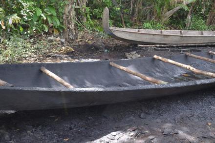 Une fois l’Angélique abattu, après avoir déterminé le dos et le ventre de la pirogue, donc du tronc, la coque est creusée avec une gouge et profilée à la hache. Puis elle est placée sur le feu et retournée plusieurs fois. Cette chauffe lui donne une certaine plasticité qui permet d’élargir ses flancs en y insérant des planches de plus en plus longues. Et le travail de patience continue jusqu’à ce que le creux et la largeur de la coque lui confère cette stabilité qui nous impressionne tant. On y ajoute des planches en guise de bordés et c’est parti. Si autrefois les pirogues étaient mues à la pagaie et à la voile faite d’un carré tressé de palme, il faut bien reconnaître que leurs lignes conviennent parfaitement à la propulsion par moteur hors-bord... qui a aussi le mérite de se relever facilement en cas d’obstacle.