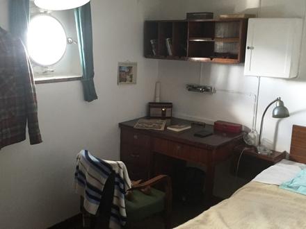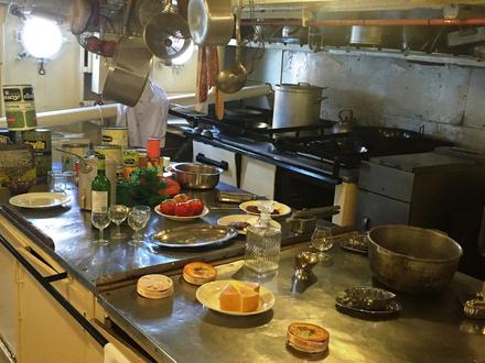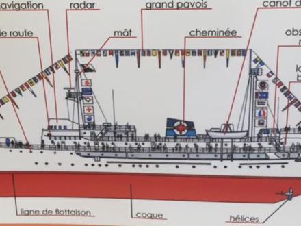 C’est donc dans l’ambiance du Musée Maritime de La Rochelle que je déambule à bord d’un bateau désert. Sur 5 ponts, la visite se poursuit depuis la salle des machines jusqu’à la passerelle à travers les cabines, cuisines, carrés des officiers ou des techniciens. Tout est présenté dans le jus et me laisse espérer la rencontre du Capitaine Haddock. Mais son Karaboudjan était un cargo alors que le France 1 est une frégate dont la carène a été dessinée pour être le plus à l’aise possible sur les fortes houles de l’Atlantique. Ce navire a presque l’air d’un paquebot de croisière avec enfilades de hublots, bois vernis, laitons lustrés et pont en teck.