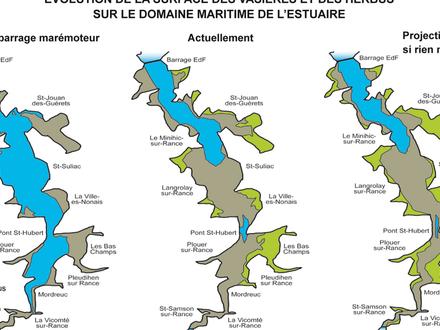 « L’usine marémotrice retient 50 000 m3 de sédiments dans l’estuaire chaque année. Les limons et sédiments déversés par la Rance sont bloqués et ne sont pas diffusés par la mer : d’une part du fait de la barrière artificielle créée dans sa partie la plus large par le barrage et d’autre part à cause du mode de fonctionnement du barrage avec le blocage de l’eau pendant plusieurs heures qui favorise l’accumulation des sédiments. Elle demande avec le soutien des communes riveraines de l’estuaire, la mise en œuvre dès 2017 d’un dévasement annuel d’urgence de 150 000 m3 pendant 5 ans et de 100 000 m3 par an pendant 20 ans, un engagement et un financement de ce plan sur 25 ans par l’état et EDF. Pendant 20 ans (1996-2005) le contrat de la baie avait pour objectif d’extraire 1 million de m3 de vase. Seuls 193.000 m3 ont été enlevés. Depuis 2005 aucun plan d’envergure n’a été déployé. Le piège à sédiment du Lyvet a été réactivité en 2014-2015 avec une extraction de 65 000 m3. L’état actuel et sa projection dans l’avenir : 70% des surfaces envasées contre moins de 30% il y a 50 ans, 1 million de m3 de vase accumulée. Un impact sur la qualité de l’eau et sur la biodiversité, les vasières étant des écosystèmes très pauvres. A l’horizon de 30 ans et sans plan d’action, l’estuaire sera victime d’une double peine, son comblement au deux tiers, les zones marines transformées en vasières ou prés-salés. La cessation de l’usine marémotrice du fait (non tenable fin de concession/juridique). »