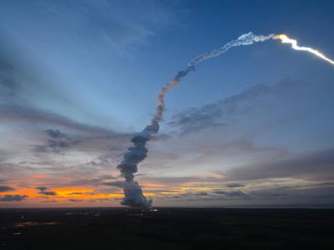 Mais il y a aussi des photos d’amateurs prises depuis la plage qui laissent place à l’imagination. Le sillage blanc laissé derrière Ariane zigzague de façon impressionnante. Ce n’est que l’effet du cisaillement du vent en altitude qui perturbe cette belle trace... (voir ci-dessous)