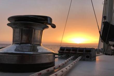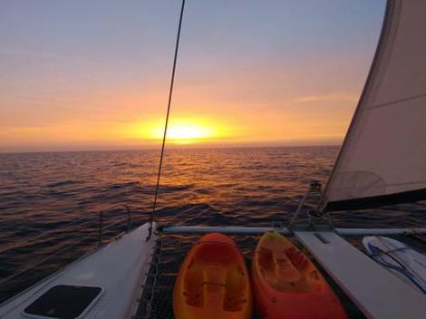 Le début de la navigation se fait au moteur, car il y a peu de vent, et plutôt de face. Passé le Cap de Fene, le vent se lève et nous pouvons enfin hisser les voiles. Quel plaisir de découvrir le comportement du bateau ! Tout se passe à merveille, sauf pour mon père qui aura malheureusement le mal de mer toute la traversée. Le coucher du soleil est splendide, la météo est belle... Aucune inquiétude à l'horizon.