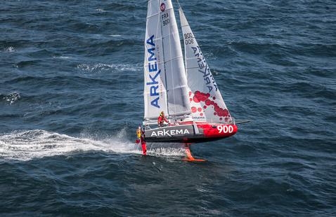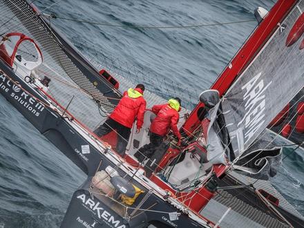 Alors le parcours « qualification » devient « voyage d’étude ». Un de plus, pour expérimenter l’apport des foils récemment adoptés. L’aller-retour vers l’W depuis l’embouchure de la Gironde permettait de rencontrer des conditions très variées mais ce n’était pas le moment d’aller se mettre en danger à proximité de cette tempête tropicale qui infligeait des vents de plus de 60 nœuds à cette pauvre mer vite démontée. Ophélia est passée rapidement mais elle a eu le temps de créer des vagues de 7 m qui, perdant un peu de leur superbe, arrivent ce lundi soir avec une hauteur de 5 m au fond du golfe de Gascogne. Ophélia n’a pas fait que nous envoyer des vagues. La vaste remontée d’air chaud qu’elle a offert aux Français pour ce week-end se traduisait par un temps instable et orageux sur le golfe de Gascogne. Là aussi de quoi faire chuter les vitesses escomptées.