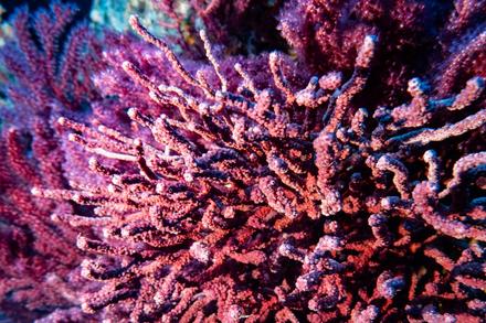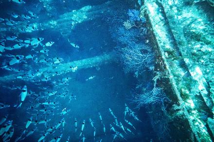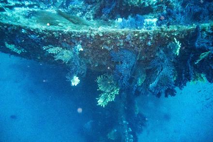 La coque du navire est recouverte de gorgones rouges et jaunes, ainsi que de coraux, créant un paysage sous-marin coloré et vibrant.