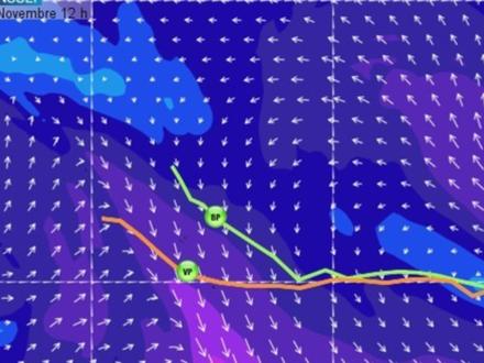Dans la journée de samedi, le vent de sud-ouest reviendra progressivement au secteur sud mais deviendra plus faible et irrégulier jusqu’à la nuit suivante. Il pourrait être tentant de mettre un peu de sud dans sa route pour éviter cette zone de vents erratiques et aller chercher des vents d’ouest à sud-ouest plus soutenus.