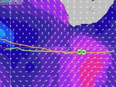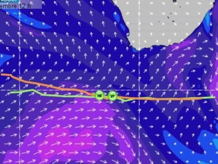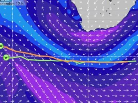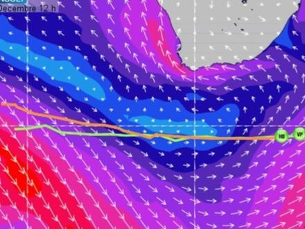 Dimanche, ce sont des vents de sud à sud-ouest très irréguliers et faiblissants qui concerneront la tête de course, au passage d’une petite dorsale. Ces conditions météo plus délicates mettront les navigateurs à rude épreuve. Il faudra s’extirper au plus vite de cette zone de vents erratiques et essayer de mettre un peu de sud dans sa route pour bénéficier d’un peu plus d’air au sud de la dorsale.