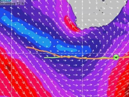 Ce dimanche, le trio de tête - Gabart, Dick et Le Cleac'h - se retrouve dans un mouchoir de poche à l’approche de la première porte des glaces. Après le passage d’un front froid, ils naviguaient en matinée dans un flux de sud d’une quinzaine de nœuds qui leur permettait de garder des vitesses honorables de l’ordre de 18 nœuds, malgré une mer désordonnée. Dans l’après-midi de ce dimanche, au passage d’un axe de dorsale, les vents molliront pendant quelques heures, ralentissant un peu la cadence. La nuit prochaine le vent adonnera pour s’orienter sud-ouest: de bonnes conditions de navigation pour franchir au portant la porte des Aiguilles.