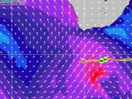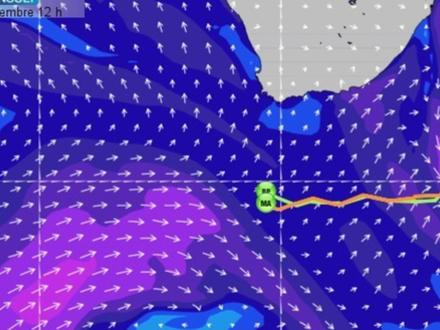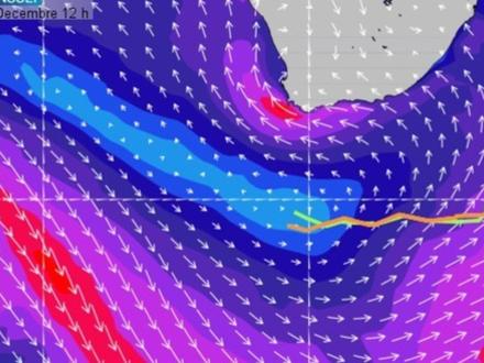 Au cours des prochaines heures, la situation météo va évoluer pour le trio de tête. Ils passeront progressivement sous l’influence d’une dépression assez creuse évoluant au niveau du 47°S. Le vent va donc se renforcer à l’approche du front froid d’une perturbation tout en prenant de la droite pour s’orienter ouest. Ce vent dans l’axe des bateaux obligera les navigateurs à empanner et à rallonger un peu la route pour garder un bon angle au vent. Dans ce jeu, Gabart, situé le plus au sud, pourrait tirer tôt ou tard son épingle du jeu puisqu’il devrait bénéficier de vents un peu plus soutenus au plus près de la dépression, tout en bénéficiant du meilleur angle par rapport au vent d’ouest pour se diriger vers la seconde porte des glaces située au niveau du 39°S. Mardi, le passage d’un front froid actif pourra une nouvelle fois redistribuer les cartes. Le flux d’ouest soutenu virera sud-ouest après le passage du front froid avec des vents de l’ordre de 25 nœuds et des rafales qui pourront atteindre 40 nœuds sous le front.