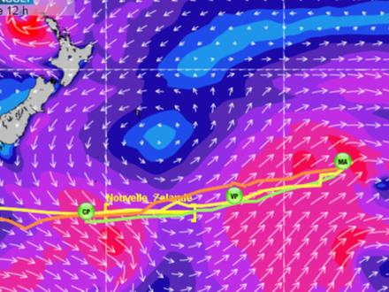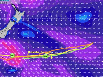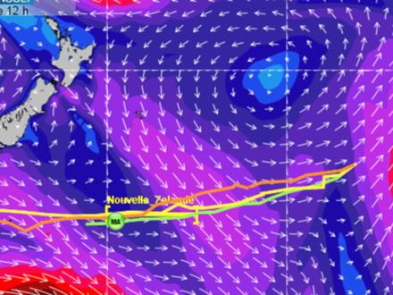 Dimanche 23 décembre : Dimanche, le flux s’orientera Nord-Ouest sur la route de Gabart et Le Cleac’h, ce qui leur permettra de faire route quasi directe en direction de la porte Pacifique Ouest. Avec un vent qui reviendra progressivement ouest à sud-ouest au passage de la porte Nouvelle-Zélande, Jean-Pierre Dick devra empanner et rallonger un peu sa route pour progresser vers la prochaine porte. Stamm et Thomson devront quant à eux faire face à des vents faibles au passage d’une dorsale.