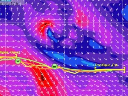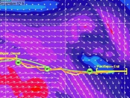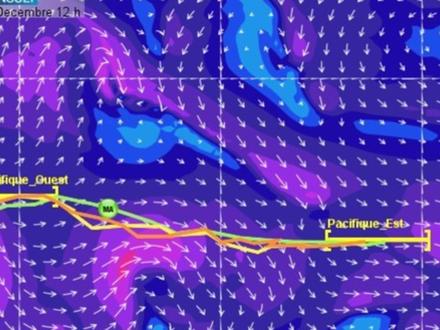 Jeudi 27 et vendredi 28 décembre : la formation d’un anticyclone au large du Chili engendrera des vents beaucoup plus irréguliers que prévu pour le groupe de tête en direction de la prochaine porte Pacifique Est. Cela ne devrait néanmoins pas remettre en cause le podium. Reste que cette situation pourrait davantage favoriser le retour de Thomson.