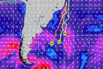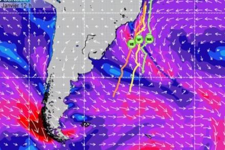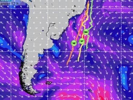 Pour le second groupe, emmené par Jean Le Cam, le rail des dépressions continue de les faire bénéficier de conditions favorables à l’approche et une fois passé le cap Horn. Ce serait moins le cas pour le dernier groupe, à partir de Bertrand De Broc. La formation d’anticyclones rendra beaucoup plus irrégulier le flux dominant de secteur ouest.