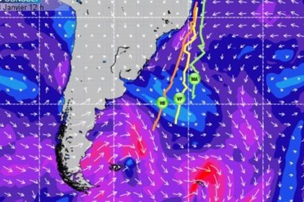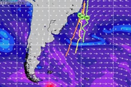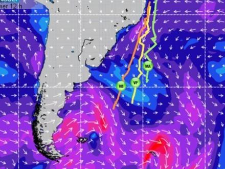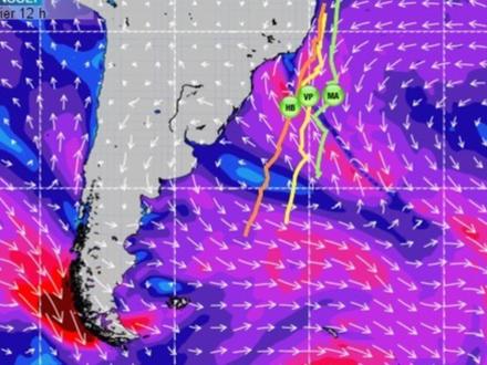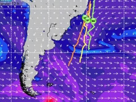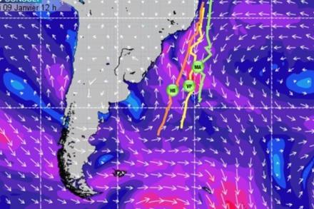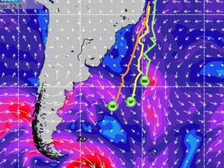 Lundi 07: La formation d’une petite cellule anticyclonique sur l’Argentine cassera rapidement l’alimentation du flux de nord-ouest entre le 35 ème et 40 ème sud. Cette évolution engendrera une baisse très marquée du vent au secteur Ouest pour 10 nds en moyenne pour Gabart et Le Cléach, avec un risque de molle.