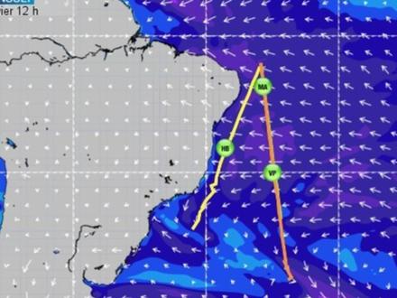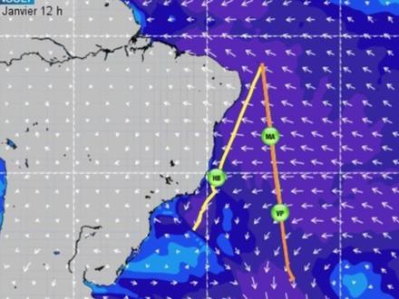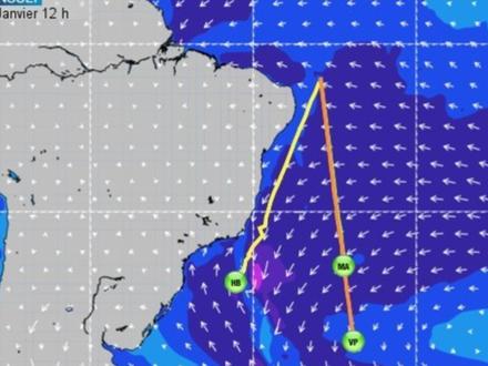 Samedi 12 : les deux premiers s’éloigneront un peu de l’anticyclone de Sainte-Hélène, et retrouveront un alizé d’Est de 15 nœuds, comme ils l’avaient rencontré fin novembre. Leur vitesse de progression sera régulière, autour de 15 nœuds voire plus. Ce sera plus délicat pour Thomson. Naviguant au près, il devra ouvrir l’angle pour garder de la vitesse mais s’éloignera de la route directe. Dick naviguera quant à lui dans un flux de Nord-Est de 15 nœuds de moyenne, sur une route similaire globalement à celle des leaders.