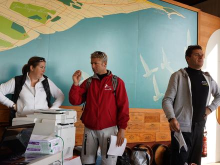 08H45: Cyrille Duchesne, prévisionniste de Météo-Consult en mission pour la direction de course, récupère les dernières informations météo. Les skippers ont un dernier briefing à 9H30. "10 à 12 noeuds en vent moyen avec des raffales à 20 noeuds. Vent de nord donc départ au portant et remontée de l'estuaire au près, avant d'entamer une longue course au portant dans le Golfe de gascogne. Le vent de Nord à Nord Est va les pousser vers le cap Finisterre. La traversée sera rapide avec un vent d'est à nord-est bien établi se renforceront à l'approche du cap Finisterre. Puis, la redescente vers Porto: le vent faiblira nettement sous l'influence d'une molle dépressionnaire. La deuxième partie de course sera plus tactique. Le jeu étant soit de contourner la bulle dépressionnaire ou de jouer avec les brises côtières."