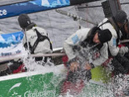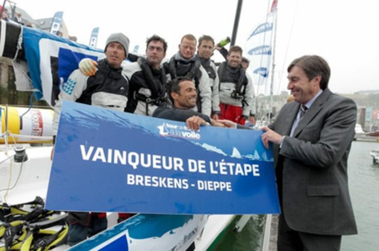 Après 24 heures et 30 minutes de navigation très inconfortable au près, Franck Cammas et ses sept équipiers ont enfin pu esquisser un très large sourire en franchissant la ligne d'arrivée en vainqueur devant le port de Dieppe.