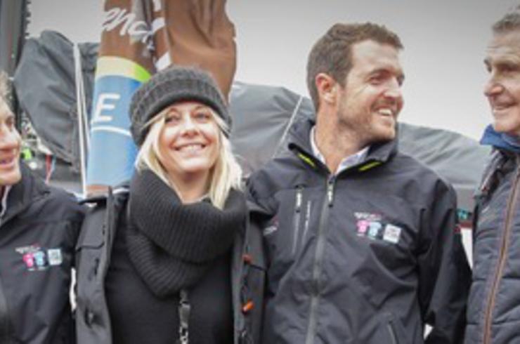 Claude Lelouch a baptisé samedi au Havre le Class40 Solidaires en Peloton de Victorien Erussard et de Thibaut Vauchel-Camus aux côtés de la marraine du bateau, Flavie Flament.